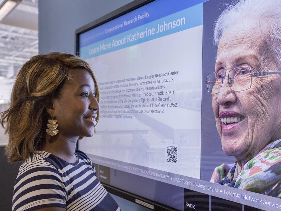 Jasmine Byrd, who works as a project coordinator at NASA's Langley Research Center, looks at an image of Katherine G. Johnson in the lobby of the building named in Johnson's honor. "I was just enthralled with her story," Byrd said. Credits: NASA/David C. Bowman