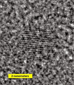 At left, a structural model of a typical silicon nanocrystal (yellow) stabilized within an organic shell of cyclohexane (blue). At right, a high-resolution transmission electron microscope photograph of a single silicon nanoparticle.