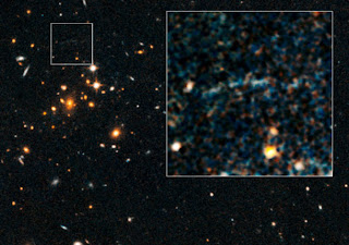 Astronomers ran across just such thing recently. Hubble observations of a distant galaxy cluster revealed an arc of light above it. That’s actually the distorted image of a more distant galaxy, and it’s a common enough sight near foreground clusters. But the thing is, that galaxy shouldn’t be there.