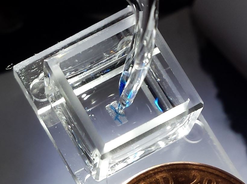 Image of the 3-D droplet bioprinter, developed by the Bayley Research Group at Oxford, producing mm-sized tissues Credit: Sam Olof/ Alexander Graham |