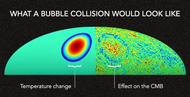 An ancient collision with a bubble universe would have altered the temperature of the cosmic microwave background (left), creating a faint disk in the sky (right) that could potentially be observed.