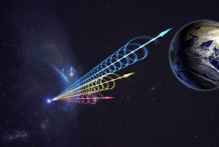 This artist's impression of a fast radio burst (FRB) reaching Earth illustrates the telltale smearing of radio waves that indicates the FRB's long journey through deep space. The colors represent different radio wavelengths, with longer (red) wavelengths arriving after shorter (blue) ones. This effect occurs when radio waves travel through plasma-rich regions of interstellar and intergalactic space.