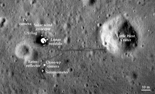 Results from the Apollo 11 mission established key paradigms of lunar and planetary science. After a harrowing descent to the surface, Armstrong set the Eagle down on the cratered basaltic plains of Mare Tranquillitatis. Extravehicular activity was brief—just two and a half hours during that first mission—and included setting up surface experiments and exploring a small cluster of craters near the lunar module and Little West Crater some 60 meters away, as shown in figure 1. Aldrin’s iconic Apollo 11 boot print photo revealed much about the lunar soil, including its fine-grained nature, its cohesiveness, and its ability to pack tightly together.