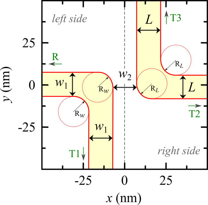 We theoretically investigate the electronic transport properties of two closely spaced L-shaped semiconductor quantum wires, for different configurations of the output channel widths as well as the distance between the wires. Within the effective-mass approximation, we solve the time-dependent Schrödinger equation using the split-operator technique that allows us to calculate the transmission probability, the total probability current, the conductance, and the wave function scattering between the energy subbands. We determine the maximum distance between the quantum wires below which a relevant non-zero transmission is still found. The transmission probability and the conductance show a strong dependence on the width of the output channel for small distances between the wires.