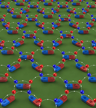 A depiction of magnetic charge ice. Nanoscale magnets are arranged in a two-dimensional lattice. Each nanomagnet produces a pair of magnetic charges, one positive (red ball on the north pole) and one negative (blue ball on the south pole). The magnetic flux lines (white) point from positive charges to negative charges. (Image credit: Yong-Lei Wang/Zhili Xiao)