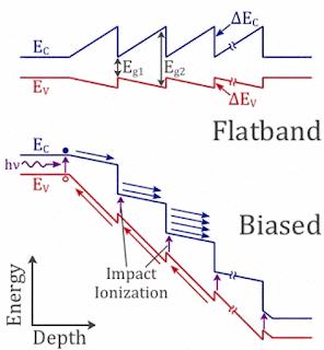 Conceptual band diagrams of a staircase APD unbiased (top) and under reverse bias (bottom). The arrows below the valance band indicate that holes do not impact ionize.