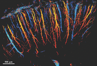Figure 1. Superresolution ultrasound image of the blood vessels in the cortex of a rat’s brain. The colors represent velocity: Dark and light blue indicate blood flow in the direction of the skull (toward the top of the image), and red and yellow indicate flow away from the skull. (Courtesy of Mickael Tanter.)