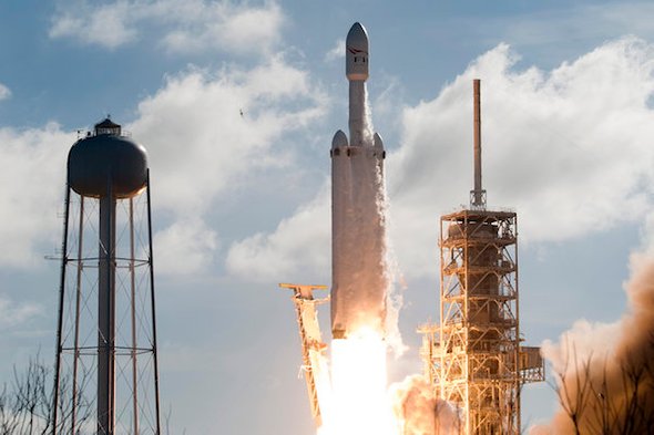 | SpaceX's Falcon Heavy rocket lifts off from the Kennedy Space Center, February 6, 2018. Credit: JIM WATSON/AFP/Getty Images |