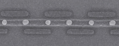 | An electron microscope image of a quantum simulator made from a 1D array of Josephson junctions (light dots). (Courtesy: Philip Krantz, Krantz NanoArt, adapted by APS / Alan Stonebraker) |