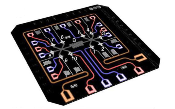 This photograph of the quantum device has components highlighted in false colour. The superconducting qubits are numbered 1–10 and the central bus resonator is labelled "B". The red and blue structures are control lines for the individual qubits. (Courtesy: Chao Song et al/ arXiv: 1703.10302)